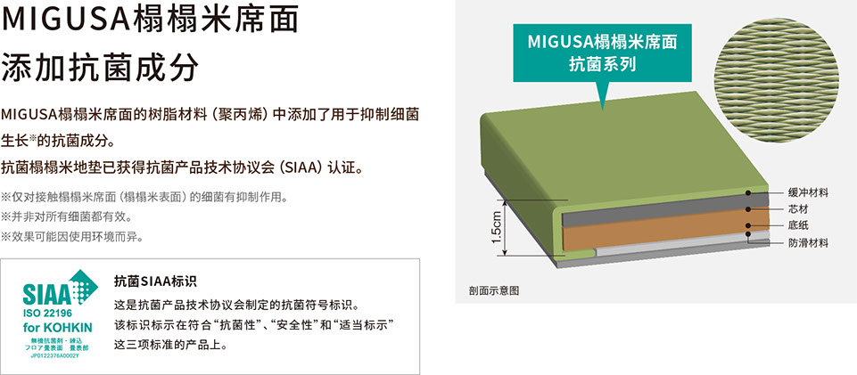 榻榻米 席面[MIGUSA]:聚丙烯、碳酸鈣 經紗:棉-酯混紡紗